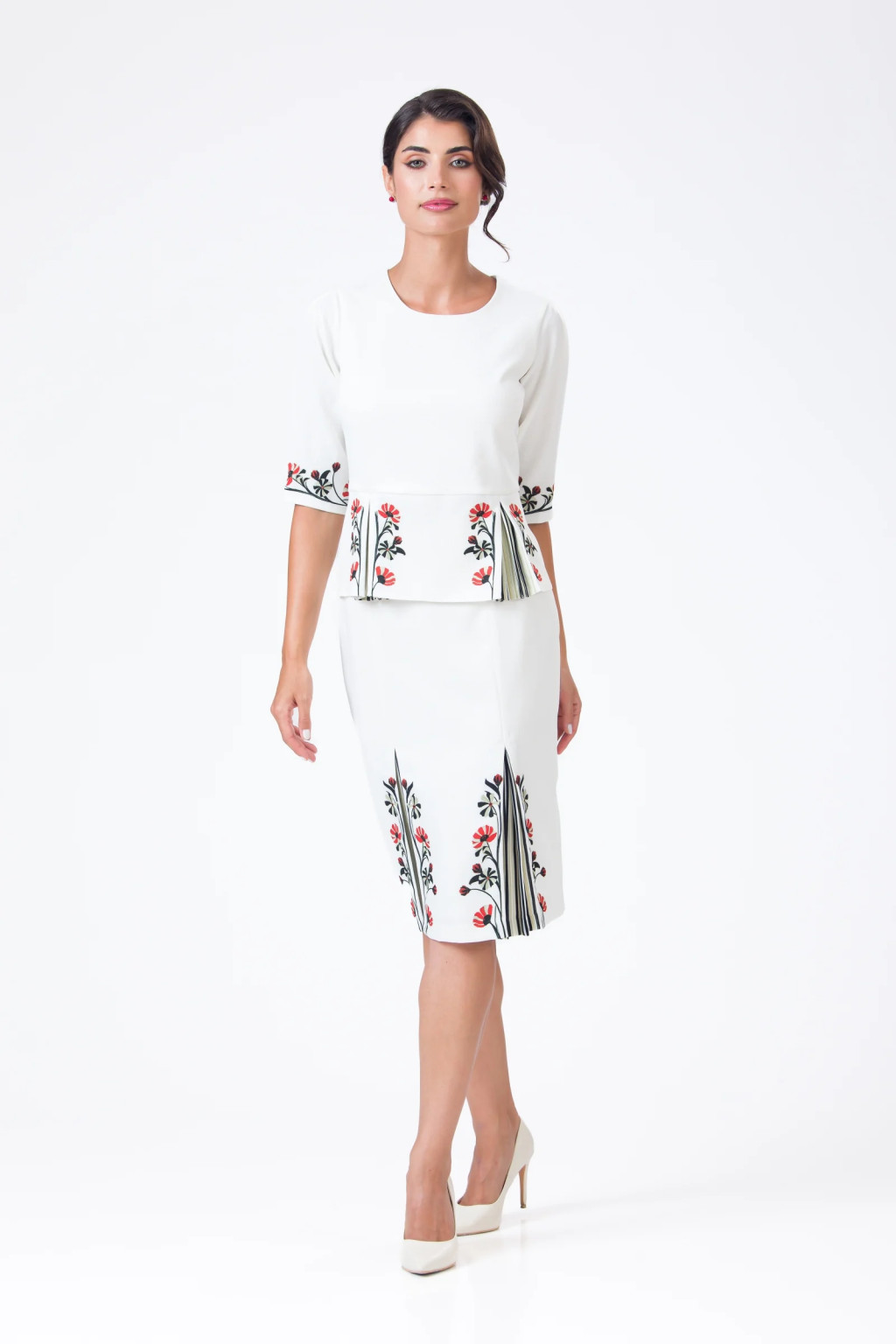 A kézzel tervezett virágmotívumok finoman jelennek meg az ujjakon és a szegélyen, ezzel művészi részletgazdagságot adva a megjelenésnek.