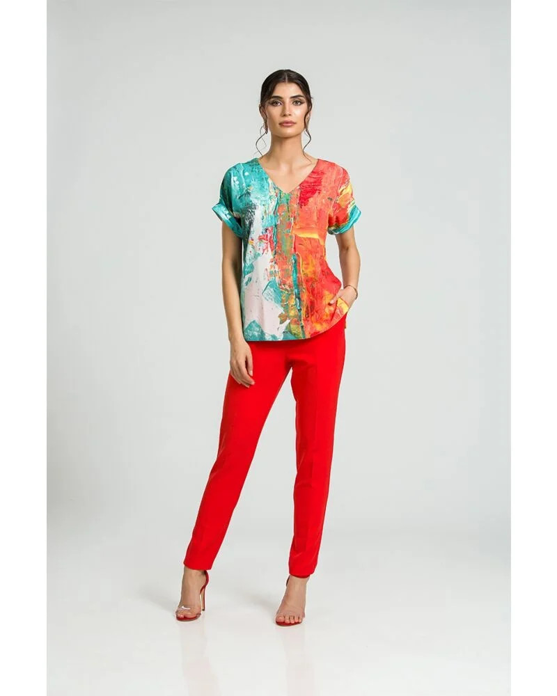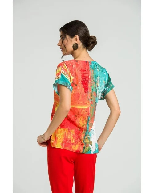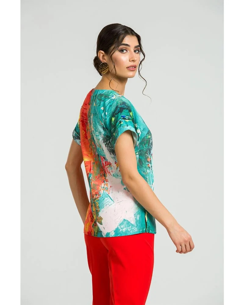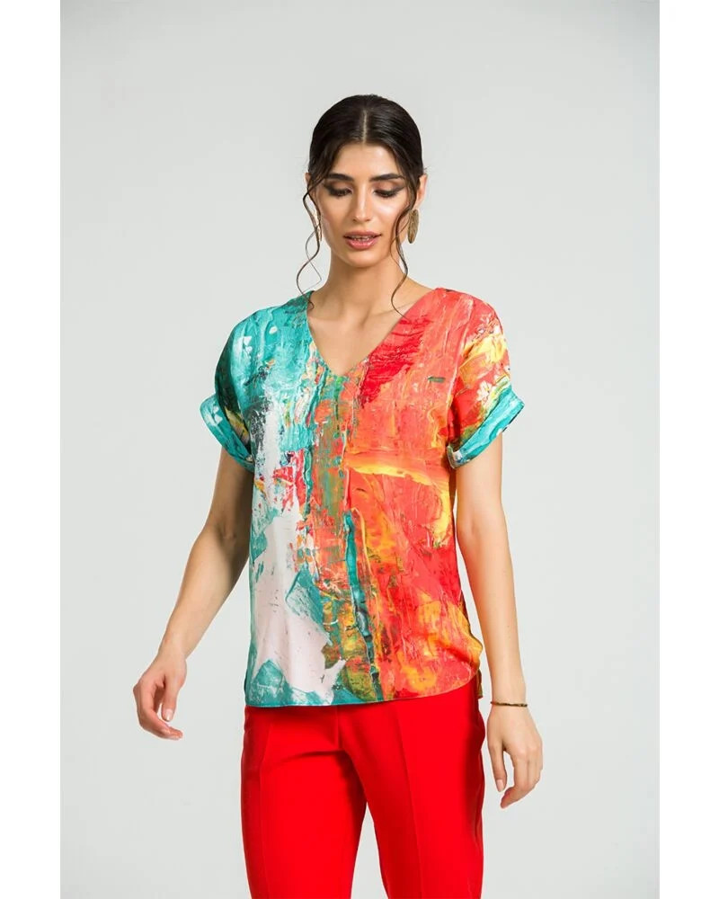 Ez a raglán ujjú felső, mintha egy modern festőműteremből lépett volna elő: lendületes ecsetvonások, élénk tónusok és váratlan színpárosítások jellemzik.