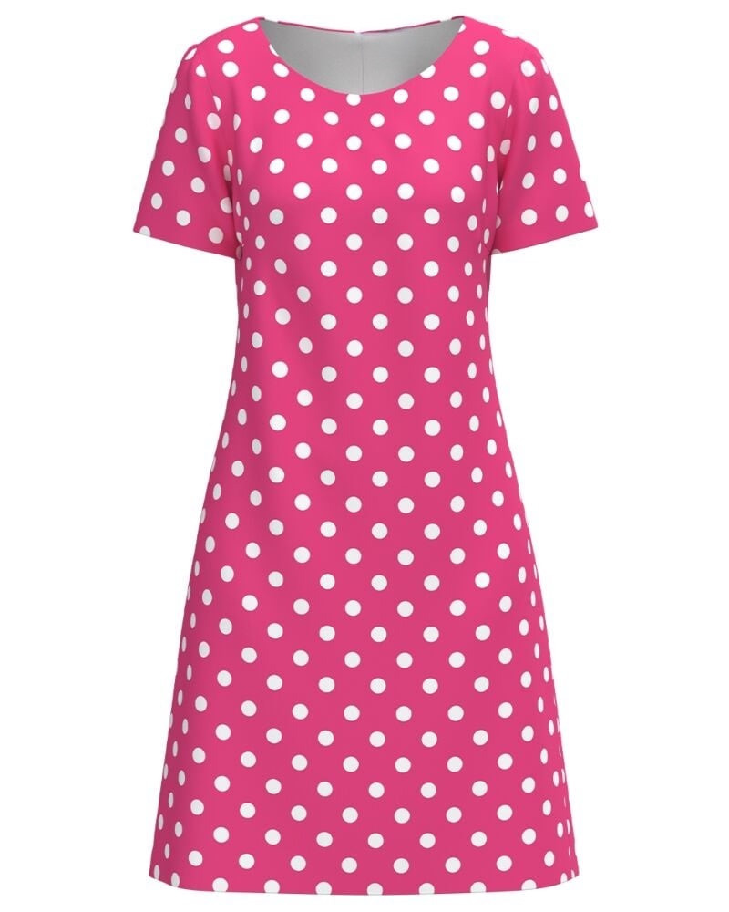 A rövid ujj és a klasszikus nyakkivágás időtlen eleganciát ad neki, amit a játékos, élénk pink alapon elhelyezett fehér pöttyök frissítenek fel.
