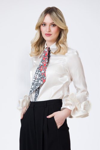 Ez a fényes szaténból készült ingblúz tökéletesen ötvözi a klasszikus eleganciát az egyedi karakterrel.
