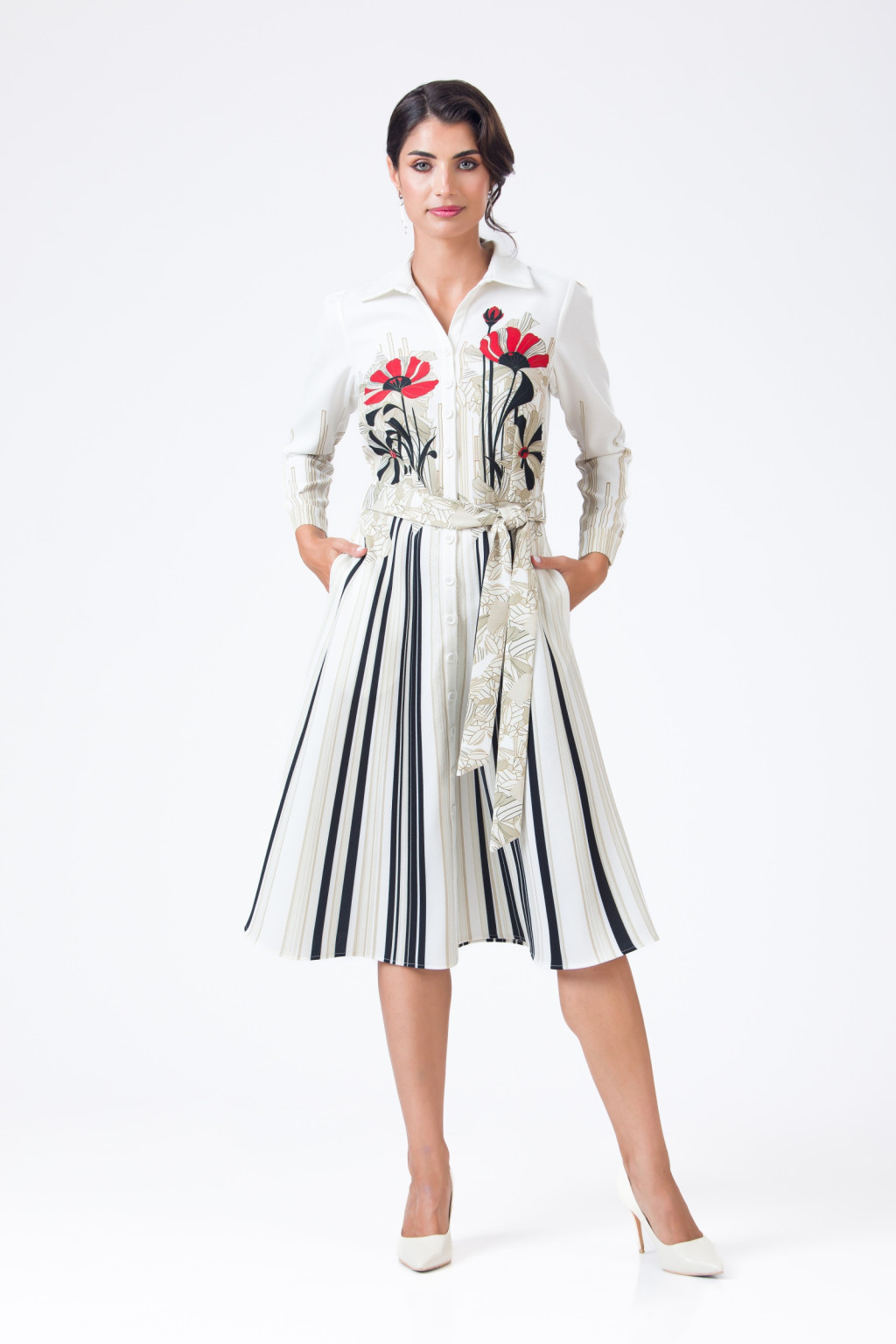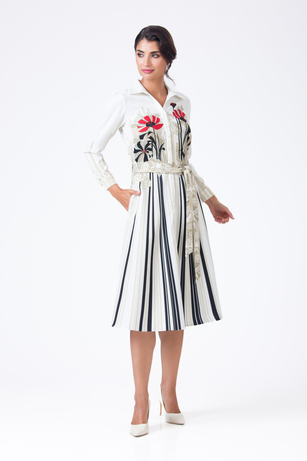 A szoknyarész függőleges vonalai optikailag nyújtanak, a felsőrész grafikus virágmotívuma pedig egyedi, művészi fókuszpontot ad.