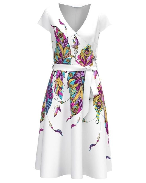 Az Elysia ruha azoknak készült, akik szeretik a nőiességüket könnyed, mégis karakteres formában megélni. A finoman elmosódó tollminták a szabadság, a lélek finomsága és a természetes szépség világát idézik meg.