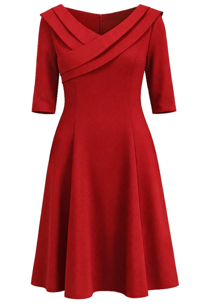 A felsőrész romantikus nyakkivágása lágy keretet ad a dekoltázsnak, az enyhén bővülő szoknyarész pedig könnyed mozgást és nőies arányokat teremt.