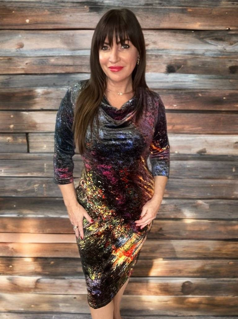 A ruha különlegessége, hogy a bársony – a fény irányától függően – minden mozdulatnál más arcát mutatja: hol mély, titokzatos árnyalatokat, hol ragyogóan színes reflexeket tár fel.