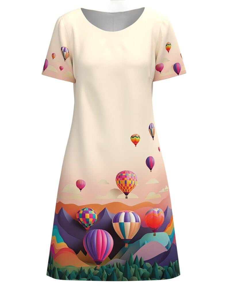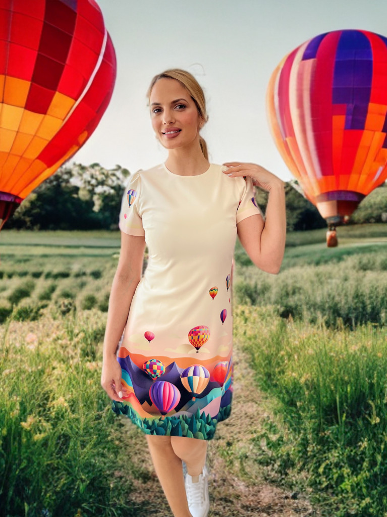 A „Kappadókia” ruha egy lenyűgöző látványvilágot idéz: színes hőlégballonok lebegnek egy álomszerű táj fölött, a lágy színátmenetek pedig finoman keretezik ezt a különleges kompozíciót.