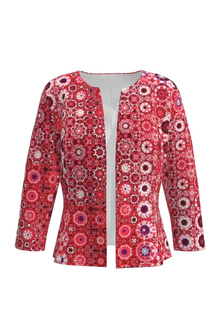 A Mandarosa blézer egy lenyűgöző darab, amely a szicíliai kerámiák ornamentikáját idézi – szimmetrikus, kaleidoszkópszerű mintázata a mediterrán nyarak színpompás gazdagságát csempészi a gardróbodba.