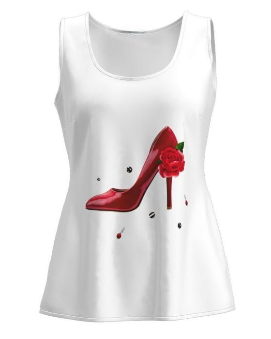 A hófehér alapot díszítő ikonikus piros tűsarkú, rúzs és virágmotívum játékos, mégis nőies és karakteres megjelenést ad, amitől minden szett azonnal egyedivé válik. Könnyed esésű, puha tapintású anyaga egész nap kényelmes viseletet nyújt, miközben a letisztult szabás a hangsúlyt a különleges mintázatra helyezi.