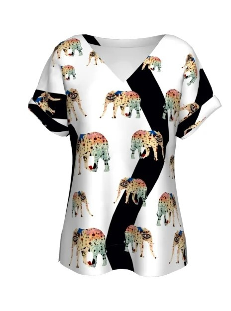 A fehér alapon kontrasztos fekete sávok között végigvonuló, művészien stilizált elefántminták egzotikus, mégis kifinomult megjelenést adnak.
