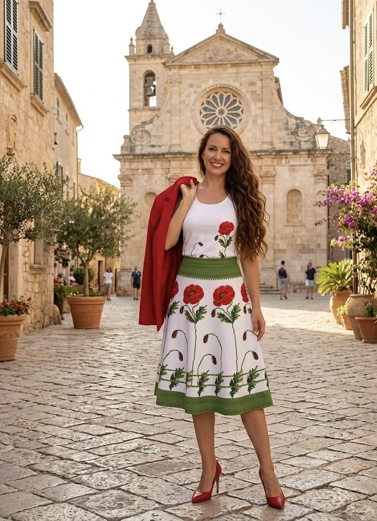 A piros pipacsokkal hímzésszerűen díszített ruha nemcsak különleges mintázatával, hanem friss, nyári színvilágával és könnyed esésével is kitűnik a hétköznapokból.