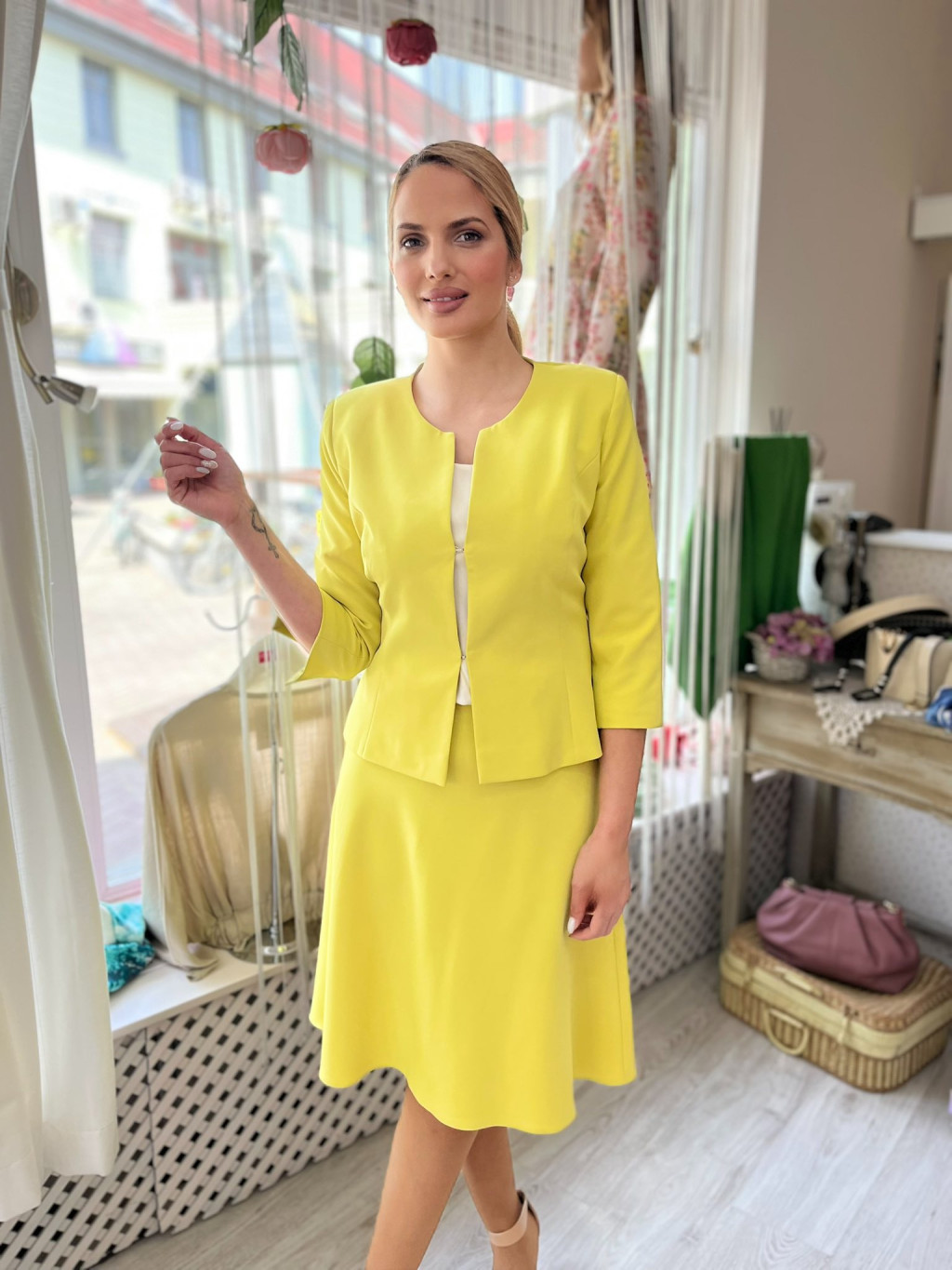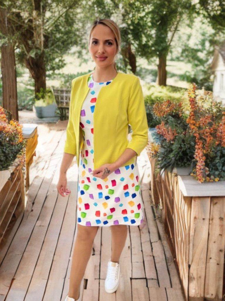 A letisztult szabásvonal és a gallér nélküli fazon különösen jól érvényesül vidám, mintás ruhák felett – nem veszi el a hangsúlyt, hanem kiemeli az összhatást.