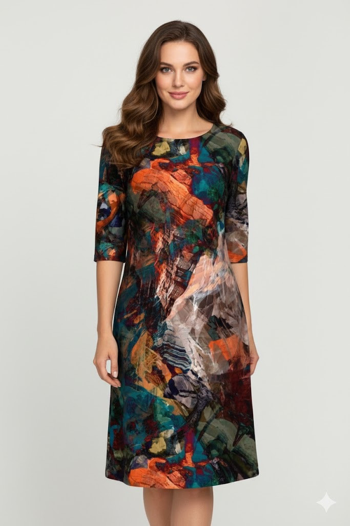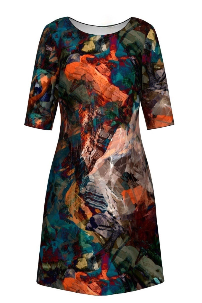 Ez a ruha olyan, mintha a tenger mélykékje, a smaragd zöld és a naplemente narancs-vöröse egyetlen lendületes ecsetvonásban találkozna.