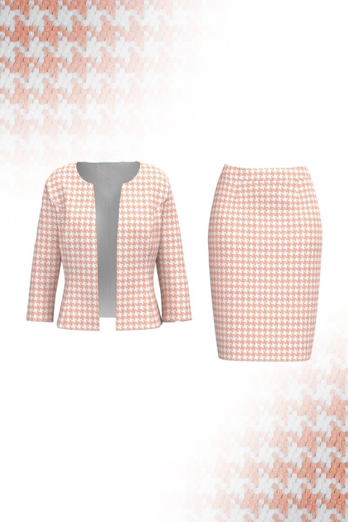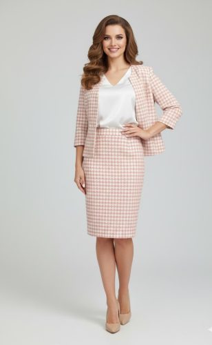 Pasztell korall-bézs pepita mintája lágyan deríti fel a hangulatot, miközben karcsúsító vonalvezetése kiemeli az alakot.