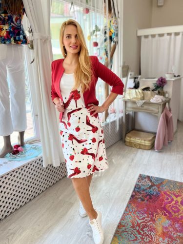 A letisztult szabásvonal és a gallér nélküli, nyitott fazon különösen jól érvényesül vidám, mintás ruhák felett – nem veszi el a hangsúlyt, hanem kiemeli az összhatást. Elöl 2 kapoccsal záródik, de ezt a legritkább esetben használjuk.