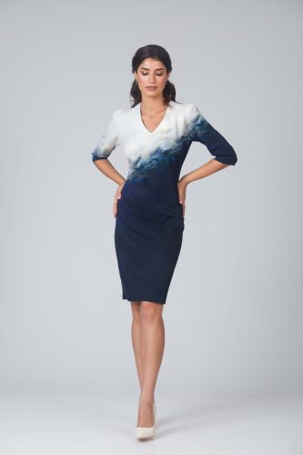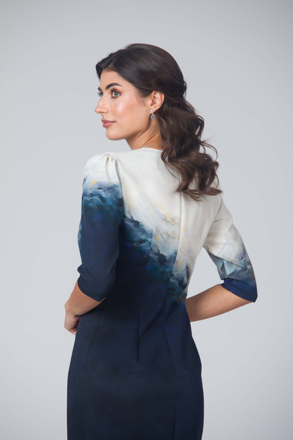 Letisztult vonalvezetés, sötétkék alapon elmosódó akvarellhatású print – a Vivienne ruha tökéletesen ötvözi a klasszikus nőiességet a modern kifinomultsággal.